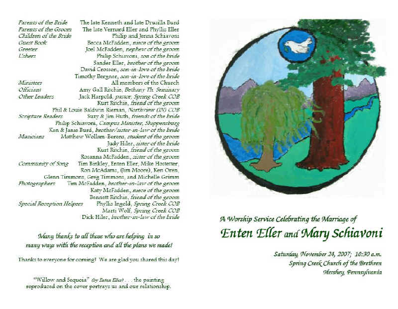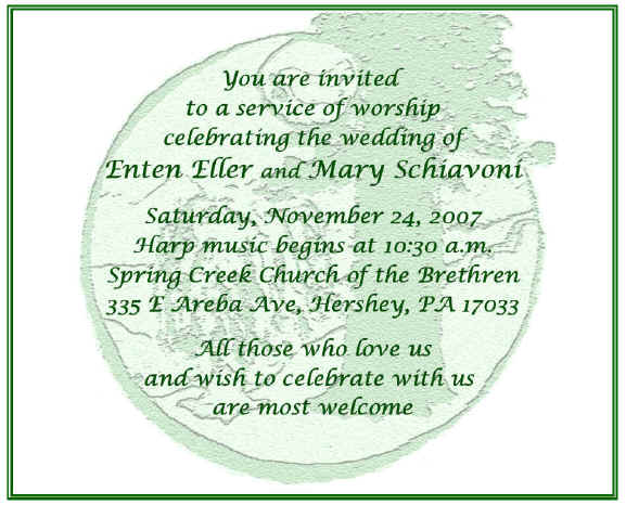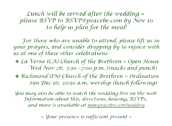 For the event in Indiana, we are combining several celebrations! During the 10:30 a.m. worship service, Mary will be received as a new member of the Richmond congregation (transferring her membership from Spring Creek), and Enten will be ordained into the set-apart ministry. Kathy and Steve Reid have accepted Enten's invitation to preach. We will provide a luncheon after the service to welcome Mary to this community, to celebrate Enten's ordination, and to have a reception to celebrate our wedding with our Indiana community! (Wow!)